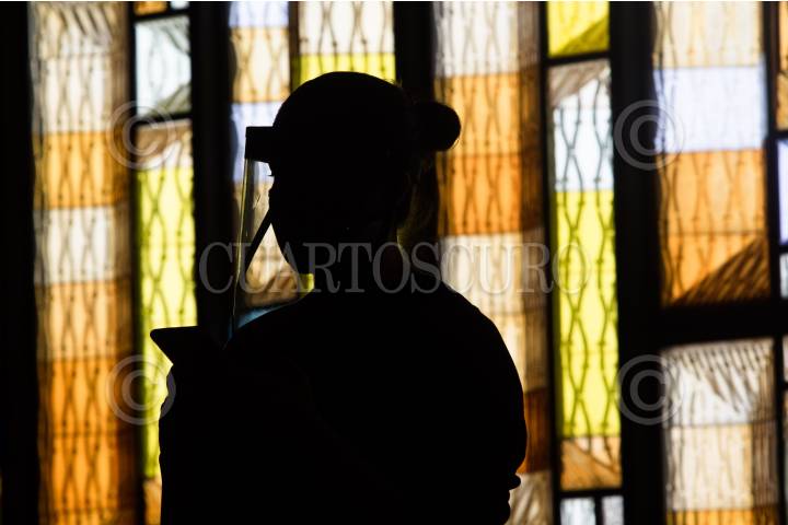 Un mujer de comunicación social de la Basílica de Guadalupe usa careta durante la misa.