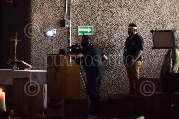 Un camarógrafo usa cubrebocas y careta durante su trabajo en la misa.