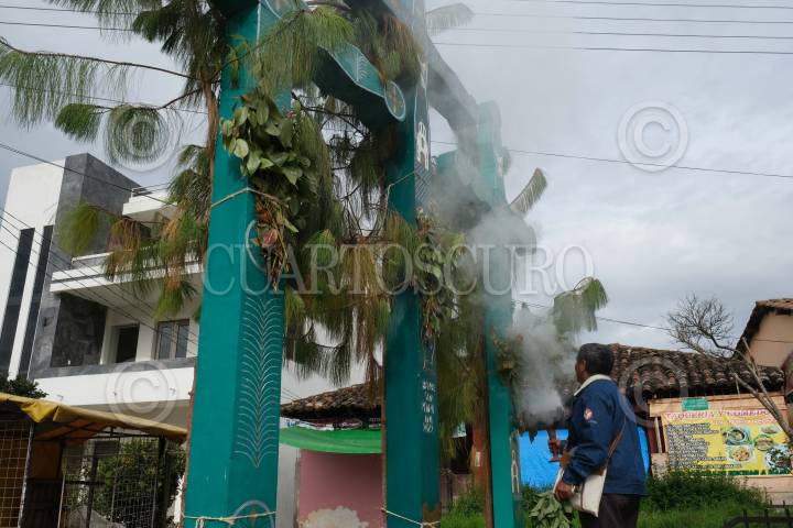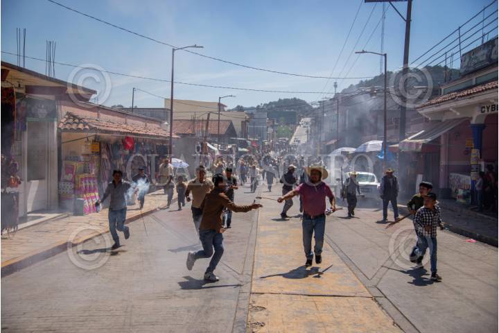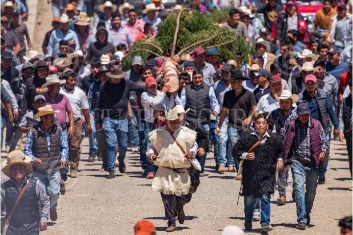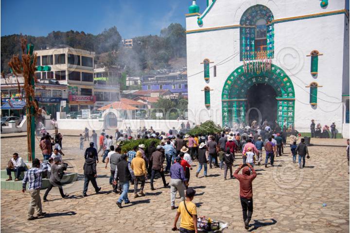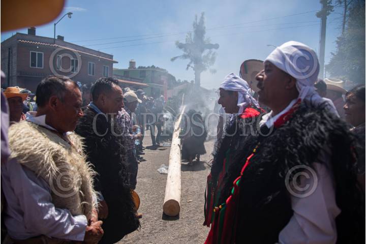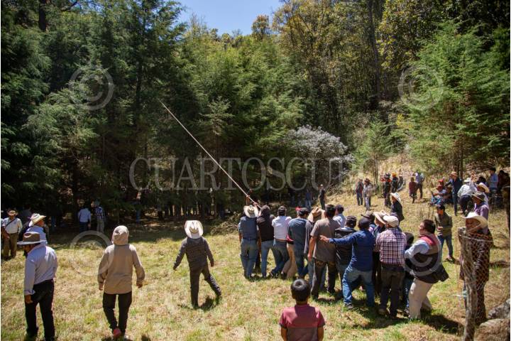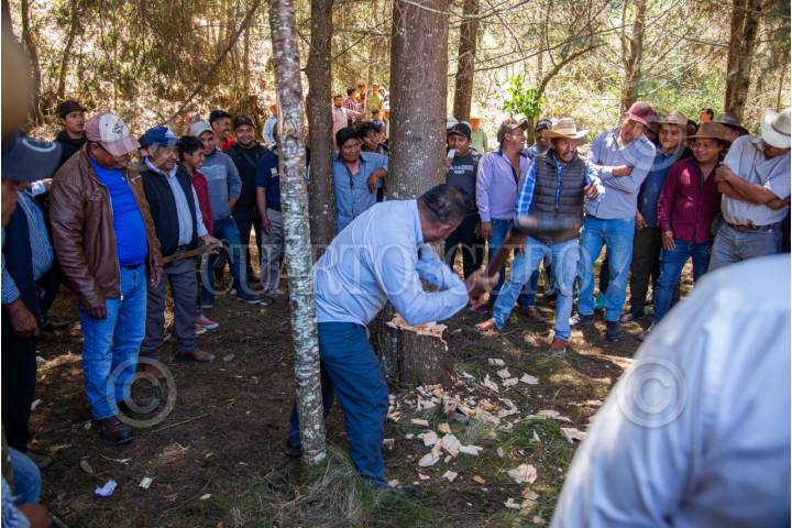 SAN JUAN CHAMULA, CHIAPAS, 26MARZO2024.- Dan inicio los preparativos para la Semana Santa en la comunidad de Chamulas, cientos de autoridades tradicionales se reúnen para traer el Muk’ta’te (árbol grande). Seleccionan el mejor ciprés para colocarlo a un lado de la Cruz dentro de la iglesia de la comunidad. Antes de talar el árbol se realiza un ritual para honrar a la naturaleza, pedirle permiso y perdón por la tala. FOTO: ISABEL MATEOS /CUARTOSCURO.COM