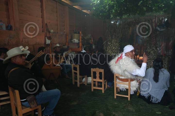 SAN JUAN CHAMULA, CHIAPAS, 20JUNIO2025.- Autoridades religiosas de la comunidad permanecen en oracion frente a un altar de flores durante la celebración de Día de Corpus Christi con una misa católica y diversas expresiones de la cultura tradicional maya tsotsil, que reflejan el sincretismo religioso y la fuerza de sus raíces comunitarias. FOTO: ISABEL MATEOS HINOJOSA /CUARTOSCURO.COM