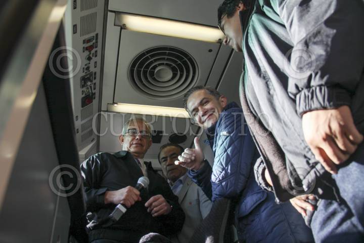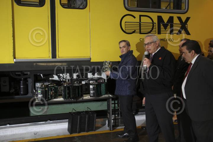 CIUDAD DE MÉXICO, 21DICIEMBRE2016.- Miguel Ángel Mancera, jefe de gobierno de la Ciudad de México, acompañado de Jorge Gaviño, director del Sistema Colectivo Metro (SCT), y José Espino, secretario general del Sindicato del Metro, encabezaron la puesta en marcha de 4 trenes de las Líneas 1, 2 , 4 y B, y digitalización del pilotaje automático de los trenes, en los talleres de Mantenimiento Sistemático de Tasqueña. FOTO: ANTONIO CRUZ /CUARTOSCURO.COM