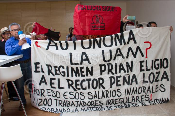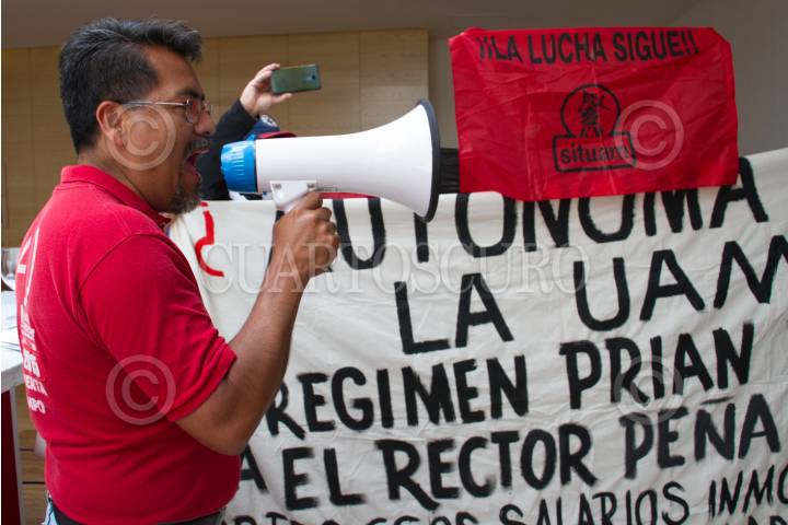 CIUDAD DE MÉXICO, 14ABRIL2019.- Un grupo de simpatizantes del Sindicato Independiente de Trabajadores de la Universidad Autónoma Metropolitana (SITUAM), se manifesto afuera del salón donde se llevaba acabo la conferencia de prensa respecto a la situación laboral de la UAM, a cargo de las autoridades de la institución, en el Hotel Fiesta Inn del Centro Histórico . FOTO: ROGELIO MORALES /CUARTOSCURO.COM