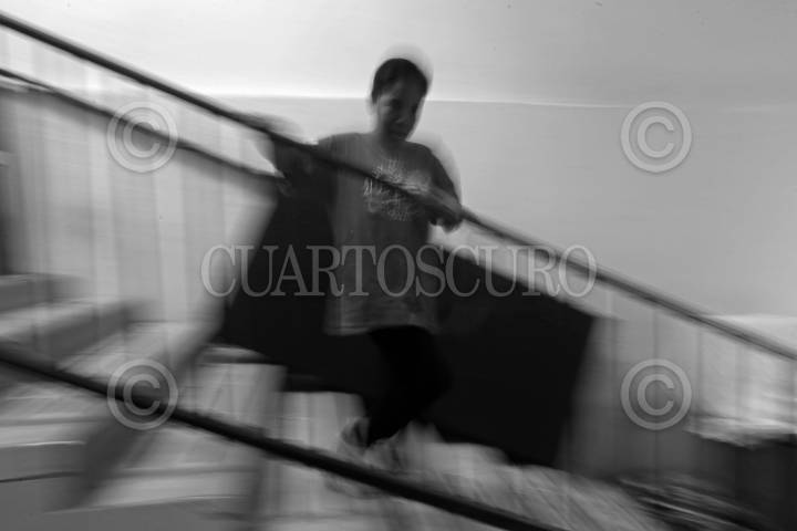 Una paciente del albergue Amigos de Juanita y Fernando A.C., baja del segundo piso del inmueble donde habita, respondiendo al llamado para recibir los alimentos en un día común en la institución que alberga a 52 personas con problemas crónico degenerativos en estado de abandono.