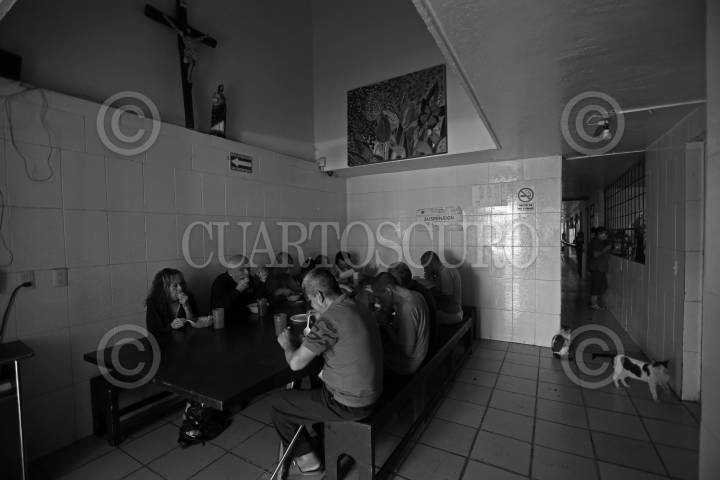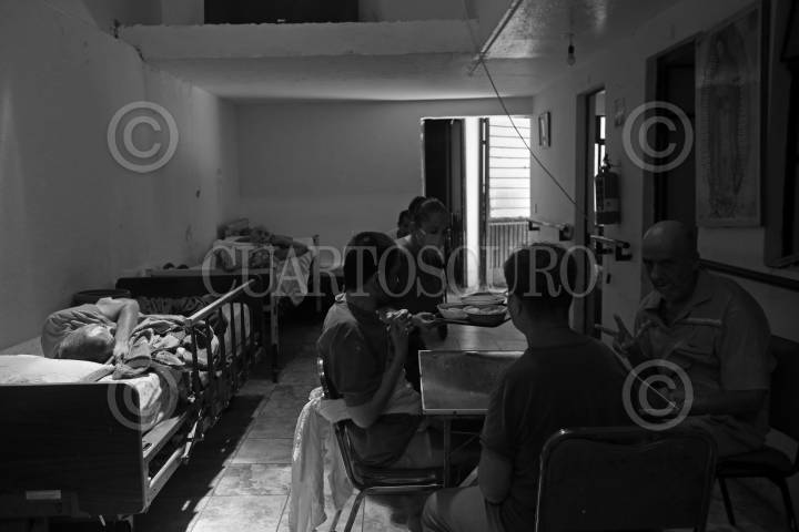 Un grupo de pacientes del albergue Amigos de Juanita y Fernando A.C., se alimentan en el comedor de la institución, en un día común en la institución que alberga a 52 personas con problemas crónico degenerativos en estado de abandono.