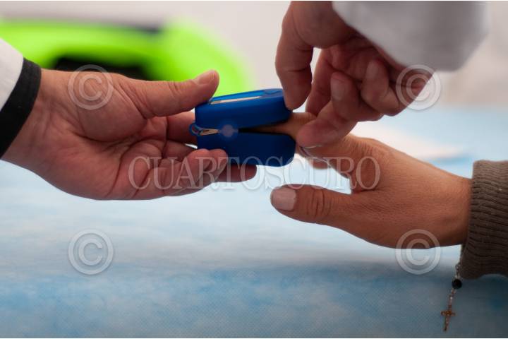 Médicos miden el oxígeno de una paciente en el kiosko de la salud.