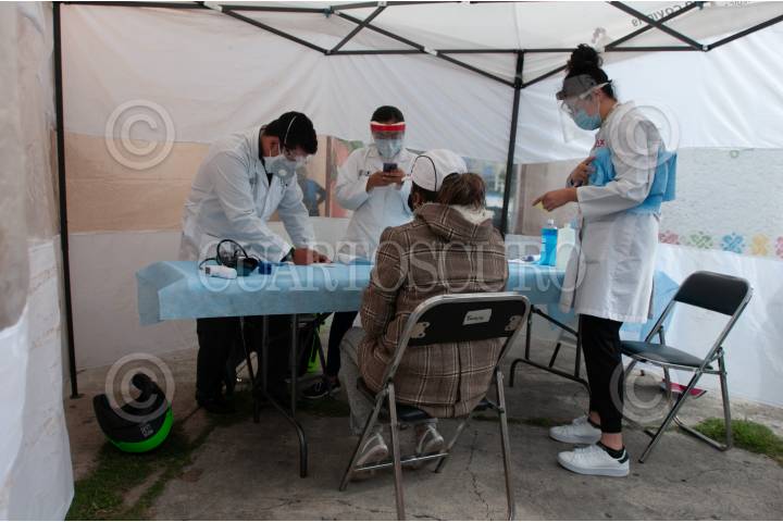 Médicos realizán un cuestionaro a una paciente con síntomas de Covid-19 en el kiosko de la salud.