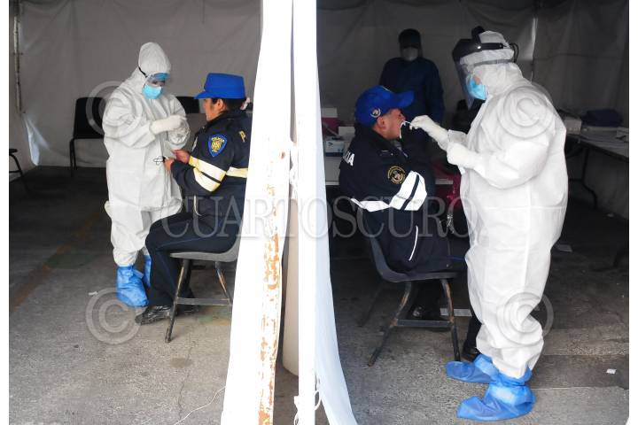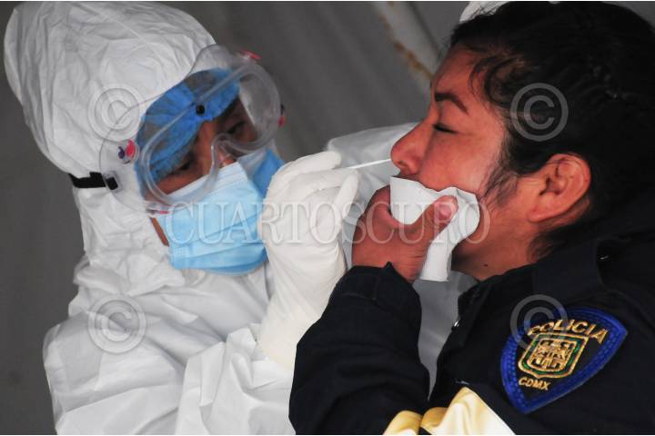 Una policía se realiza la prueba para detectar Covid-19 en el Quiosco ubicado en la Alcaldía Venustiano Carranza.
