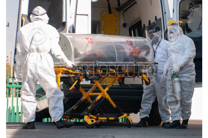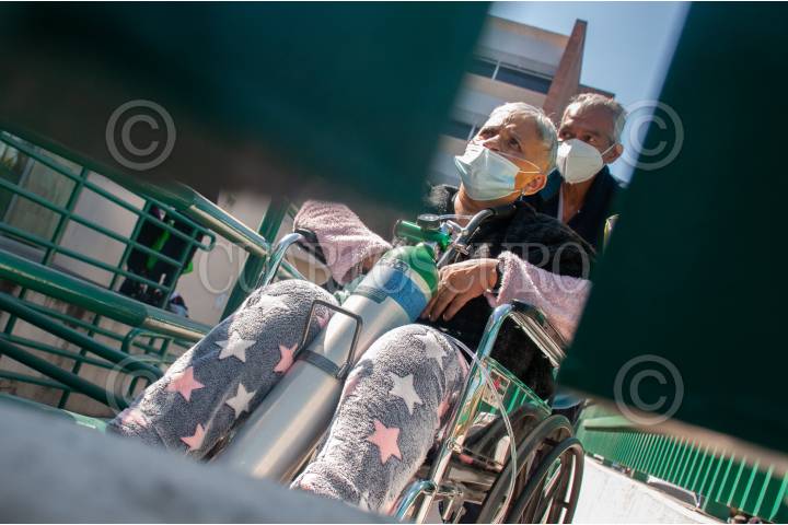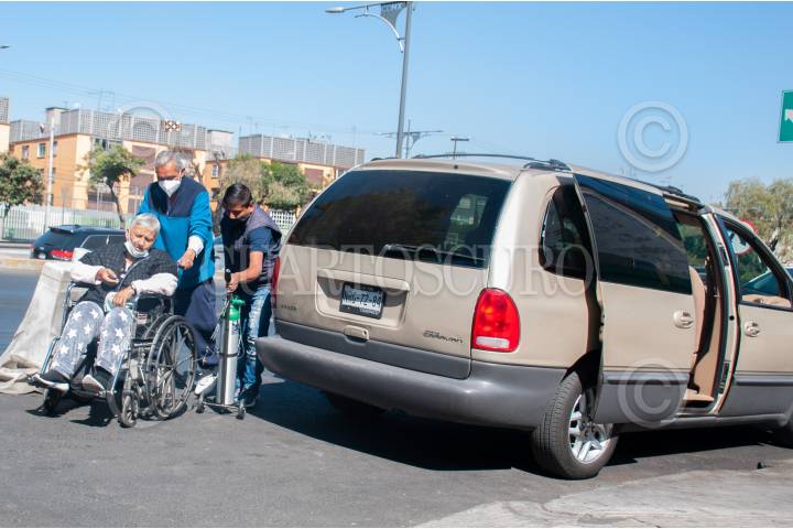Una pareja de adultos mayores ingresan al Hospital Troncoso donde son recibidos los enfermos por Covid-19. La mujer lleva entre sus piernas un tanque de oxígeno para ayudarla a respirar.