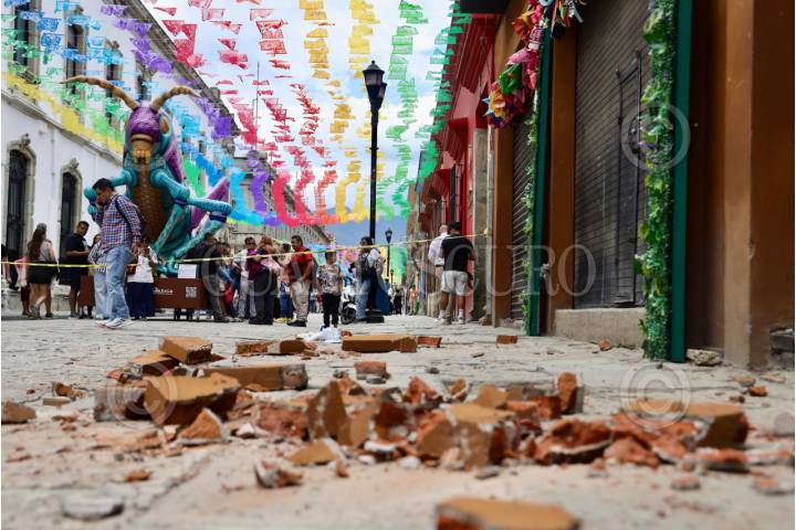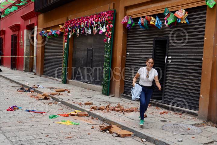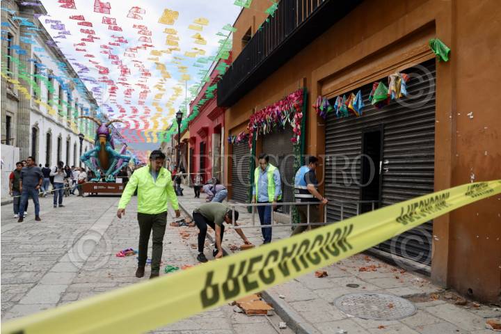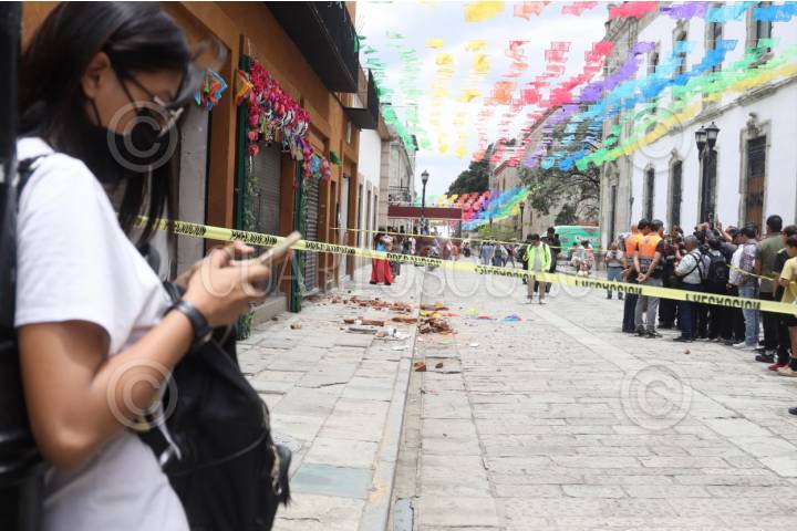 OAXACA DE JUÁREZ, OAXACA, 02AGOSTO2025.- Daños menores se registraron en Oaxaca luego del sismo de magnitud 5.9 ocurrido a las 11:58 horas de este sábado con epicentro en Tlacolula de Matamoros, así lo reportó la Coordinación Estatal de Protección Civil y Gestión de Riesgos. En la centro histórico, un joven de 15 años resultó lesionado por la caída de mampostería de un edificio ubicado sobre el andador turistico Macedonio Alcalá. FOTO: CAROLINA JIMÉNEZ/CUARTOSCURO.COM