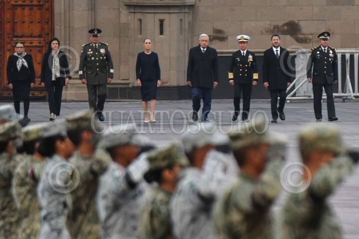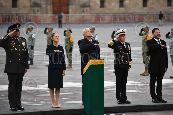 CIUDAD DE MÉXICO, 19SEPTIEMBRE2024.- Andrés Manuel López Obrador, presidente de México, encabezó la ceremonia de izamiento de bandera a media asta en memoria de las víctimas de los sismos de 1985 y 2017, realizada en el zócalo capitalino. Lo acompañan: Luis Cresencio Sandoval, secretario de la Defensa Nacional; Claudia Sheinbaum, presidenta electa de México; Rafael Ojeda Durán, secretario de Marina y Martí Batres, jefe de Gobierno. FOTO: MARIO JASSO/CUARTOSCURO.COM