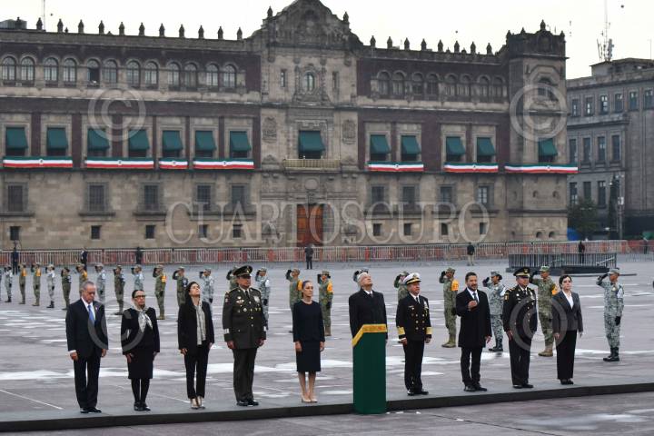 CIUDAD DE MÉXICO, 19SEPTIEMBRE2025.- Claudia Sheinbaum, presidenta de México, encabezó la ceremonia de izamiento de bandera nacional a media asta en memoria de las víctimas de los sismos de 1985 y 2017, realizada en el zócalo capitalino. La acompañan: Omar García Harfuch; Clara Brugada, jefa de Gobierno; Ricardo Trevilla Trejo, secretario de la Defensa Nacional, Raymundo Morales, secretario de Marina, y Rosa Icela Rodríguez, secretaria de Gobernación. FOTO: MARIO JASSO/CUARTOSCURO.COM