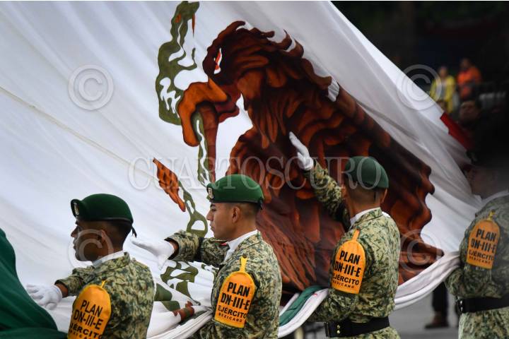 CIUDAD DE MÉXICO, 19SEPTIEMBRE2024.- Integrantes del Plan DN-III-E de la Secretaría de la Defensa Nacional (SEDENA) durante la ceremonia de izamiento de bandera a media asta en memoria de las víctimas de los sismos de 1985 y 2017, realizada en el zócalo capitalino. FOTO: MARIO JASSO/CUARTOSCURO.COM