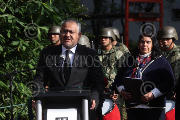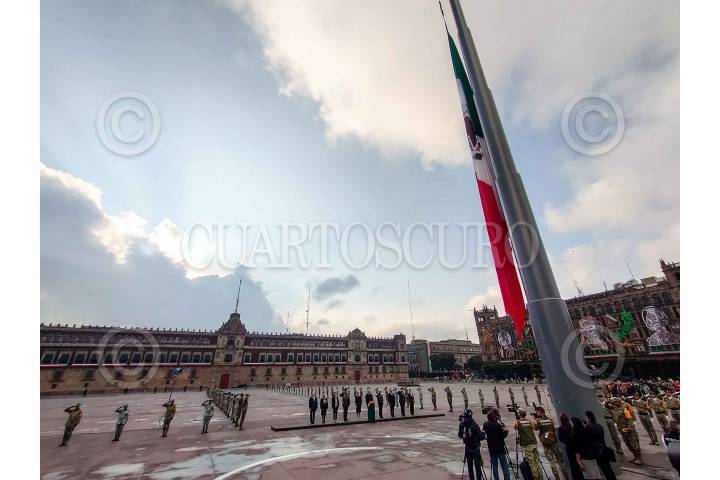 CIUDAD DE MÉXICO, 19SEPTIEMBRE2024.- Ceremonia de izamiento de bandera a media asta en memoria de las víctimas de los sismos de 1985 y 2017, realizada en el zócalo capitalino. FOTO: MARIO JASSO/CUARTOSCURO.COM