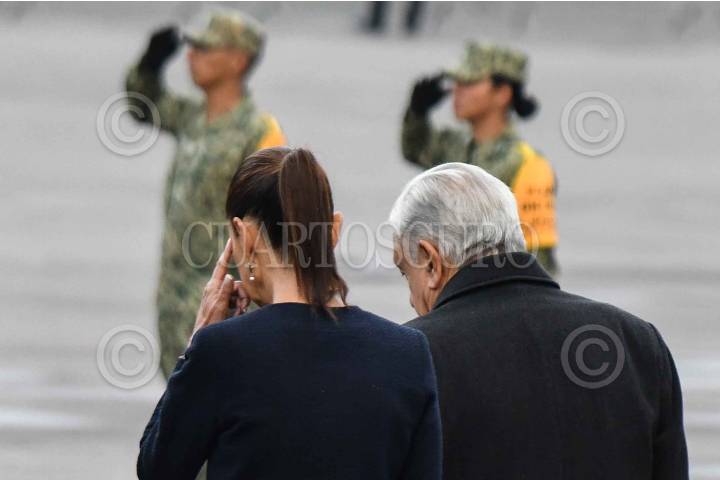 CIUDAD DE MÉXICO, 19SEPTIEMBRE2024.- Claudia Sheinbaum, presidenta electa de México, y Andrés Manuel López Obrador, presidente de México, al finalizar la ceremonia de izamiento de bandera a media asta en memoria de las víctimas de los sismos de 1985 y 2017, realizada en el zócalo capitalino. FOTO: MARIO JASSO/CUARTOSCURO.COM