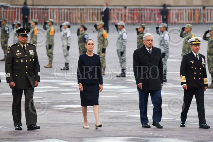 CIUDAD DE MÉXICO, 19SEPTIEMBRE2024.- Luis Cresencio Sandoval, secretario de la Defensa Nacional; Claudia Sheinbaum, presidenta electa de México; Andrés Manuel López Obrador, presidente de México, y Rafael Ojeda Durán, secretario de Marina, encabezaron la ceremonia de izamiento de bandera a media asta en memoria de las víctimas de los sismos de 1985 y 2017, realizada en el zócalo capitalino. FOTO: MARIO JASSO/CUARTOSCURO.COM