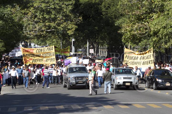 VILLAHERMOSA, TABASCO, 05NOVIEMBRE2012.- Rogers Arias García, dirigente estatal del SITET encabeza un movimiento del magisterio que dio inició en el monumento a Gregorio Méndez con al menos quinientos educadores de distintos planteles escolares de los 17 municipios. Exigen en un plantón en las instalaciones de la Secretaría de Educación Pública local; tras una marcha por calles de la capital, que se cumpla la carta petitoria con diez punto de acuerdo y ademas mejoras en las condiciones laborales, planteles educativos dignos y el pago atrasado de prestaciones. FOTO: MARCO POLO GUZMÁN HERNÁNDEZ /CUARTOSCURO.COM
