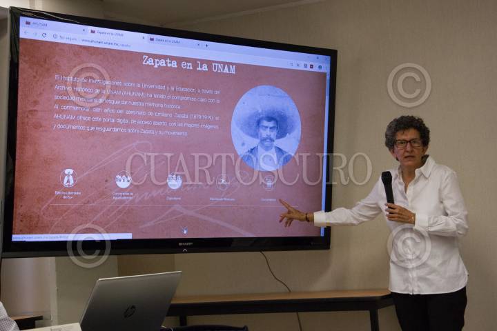 CIUDAD DE MÉXICO, 10ABRIL2019.- Clara Inés Ramirez, presentó el sitio web Zapata en la UNAM, el cual pondrá a disposición del público más de 400 imágenes y documentos sobre el Caudillo del Sur, pertenecientes al Archivo Histórico de la Universidad Nacional, esto en la sala A Instituto de Investigaciones sobre la universidad y la Educación de Ciudad Universitaria. FOTO: ROGELIO MORALES /CUARTOSCURO.COM