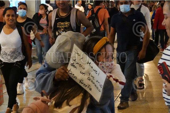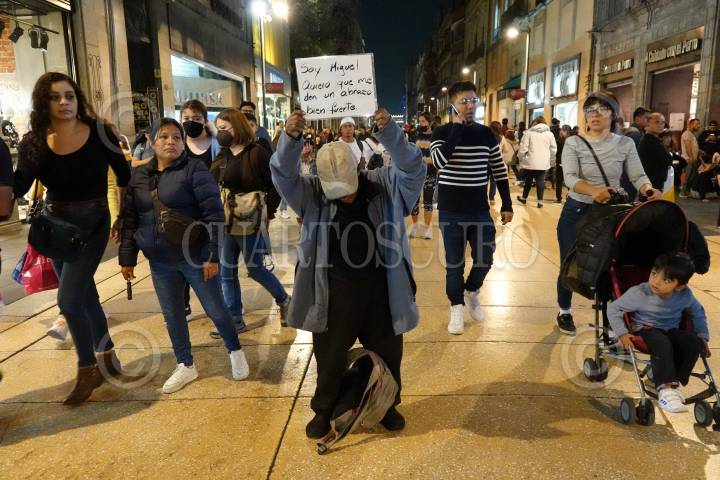 Con un cartel un adulto mayor pide abrazos en la calle de Madero en el Centro Histórico