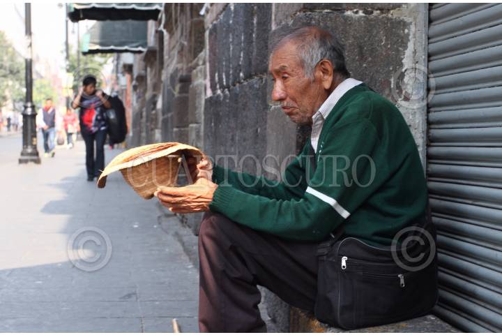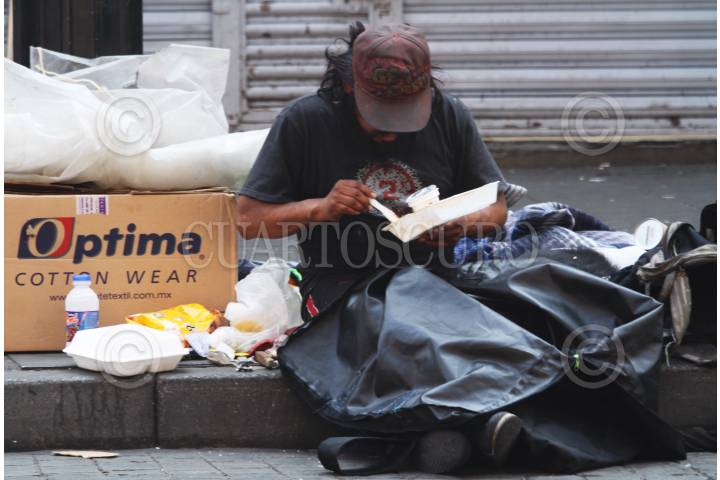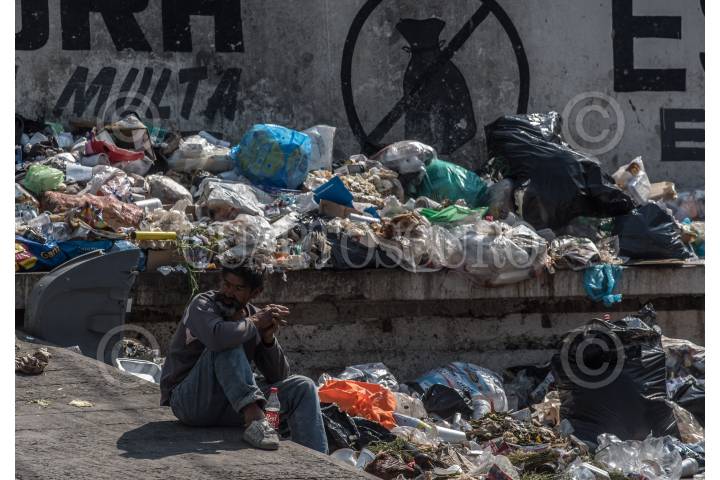 Una persona en situación de calle espera sentada a un costado de una basurero de un mercado de la entidad.