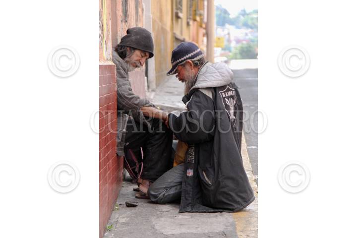 CUERNAVACA, MORELOS, 05ENERO2016.- Una persona en situación de calle ayuda a su compañero sobándole un brazo lesionado en una de las calles del centro. FOTO: PATRICIA MORALES CUARTOSCURO.COM