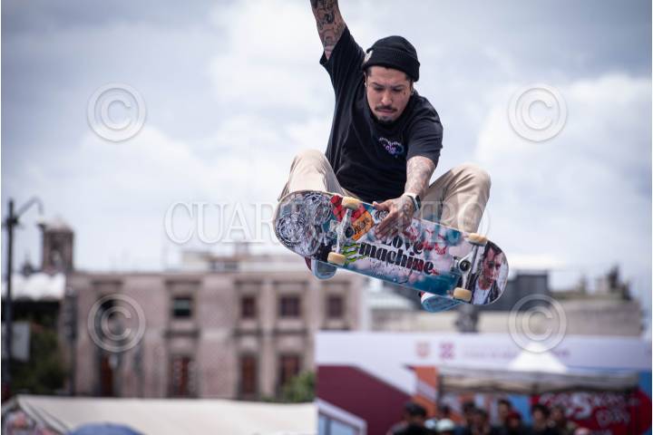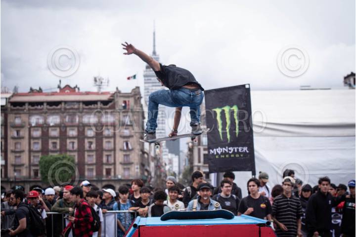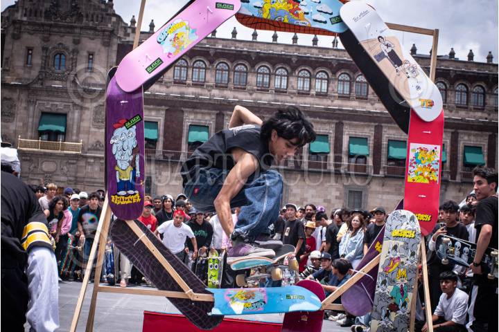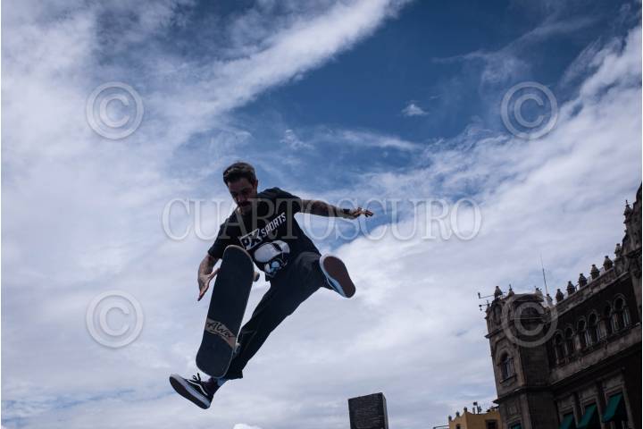 CIUDAD DE MÉXICO, 21JUNIO2024.- Un joven hace un truco con su patineta en el Zócalo durante el “Go Skate Day”, en el marco del día mundial del skate. FOTO: ALICE MORITZ/CUARTOSCURO.COM