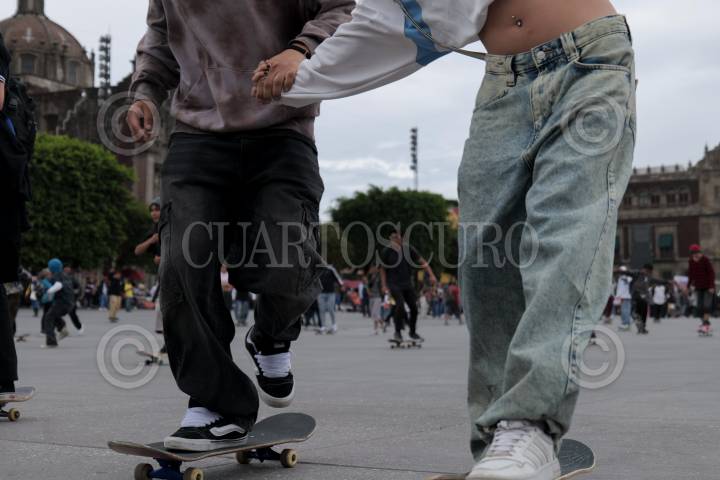 CIUDAD DE MÉXICO, 21JUNIO2024.- Andando en patineta, una pareja se toma de la mano en el Zócalo durante el “Go Skate Day”, en el marco del Día Mundial del skate. FOTO: ALICE MORITZ/CUARTOSCURO.COM