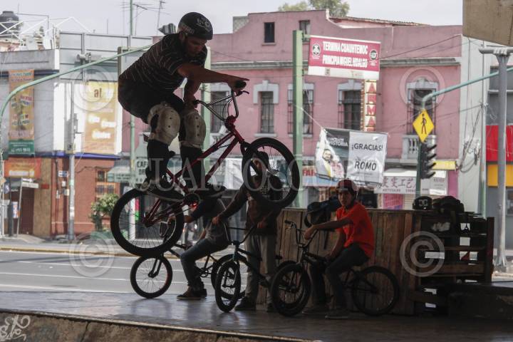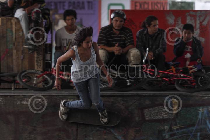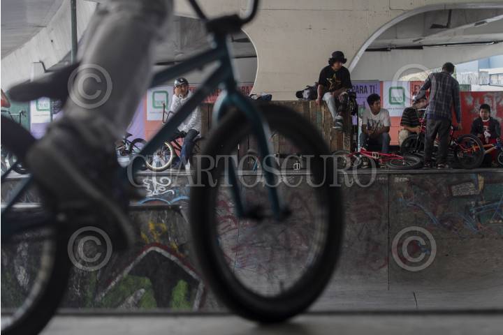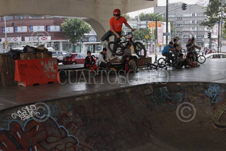 MÉXICO, D.F., 09SEPTIEMBRE2012.- Jóvenes deportistas y practicantes de la bicicleta y patineta, se reúnen en la pista de Skateboard ubicada debajo del puente de Circuito y San Cosme para realizar algunos trucos y acrobacias. Estos lugares recreativos son parte importante en el fomento al deporte y actividades urbanas. FOTO: ENRIQUE ORDÓÑEZ /CUARTOSCURO.COM