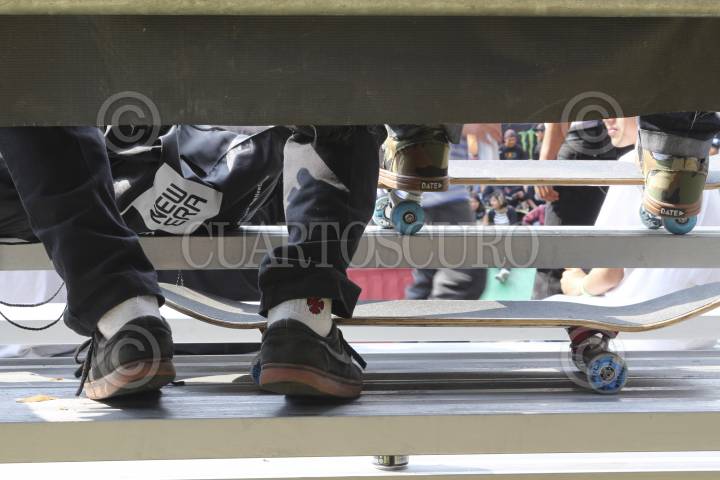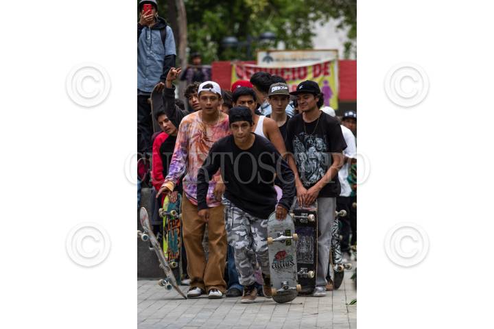 Chavos que practican el skateboard en la Alameda Central, en donde entre ellos muestran sus mejores movimientos.