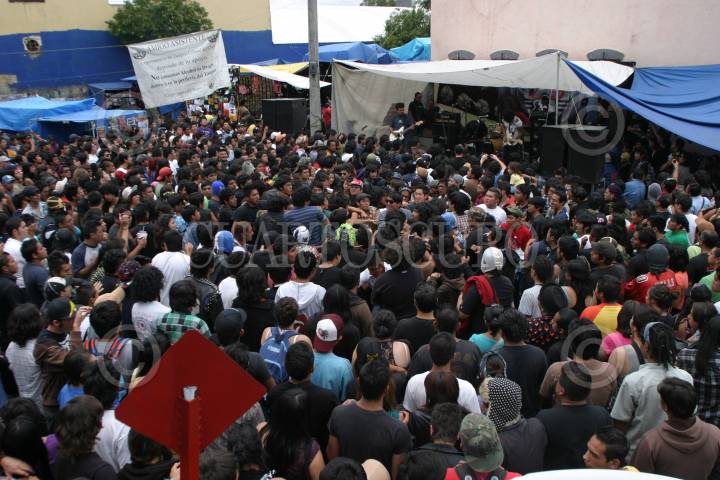 MÉXICO, D.F., 14AGOSTO2010.- Cientos de jóvenes de todas las edades se hicieron presentes en el Tianguis Cultural del Chopo en la mesa de reflexión "La escena del Rock en México", donde participaron Charly Montana, Rafael Acosta, de los Locos del Ritmo, Oiran de Austin TV y el periodista Javier Hernández Chelico de la Jornada. FOTO: MISAEL VALTIERRA/CUARTOSCURO.COM