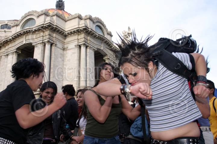 MEXICO, D.F., 08MARZO2005.- Se realizó un concierto de rock a un lado del Palacio de Bellas Artes, en el marco de la celebraciones del Día Internacional de la Mujer. En la imagen una chica Punk baila un slam. FOTO: Moisés Pablo/CUARTOSCURO.COM