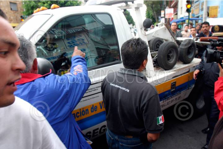 MÉXICO, D.F., 06OCTUBRE2006.- En la colonia Anáhuac, tripulantes de la grúa 07 de la Secretaría de Seguridad Pública intentaron llevarse un coche al que le causaron daños. Al intentaron escapar la gente los detuvo hasta que llegó un jefe para que se responzabilizaran por los hechos. FOTO: PEDRO MARRUFO/CUARTOSCURO.COM