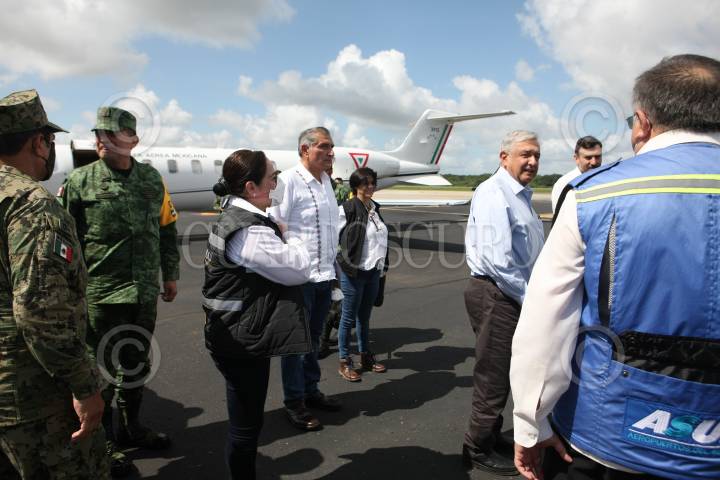El presidente de México Andrés Manuel López Obrador en compañía de los secretarios de Marina, SEDENA, coordinadora Nacional de Protección Civil, gobernador Adán Augusto López Hernández y una comitiva, realizan un sobre vuelo a zonas afectadas por las lluvias en Tabasco.