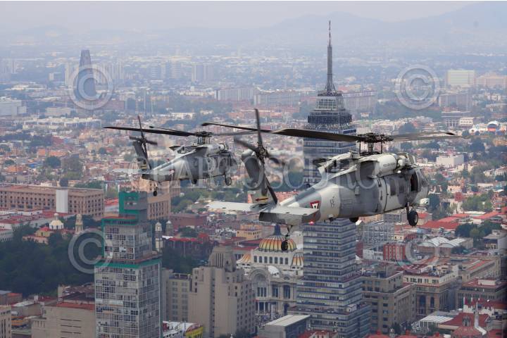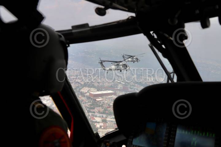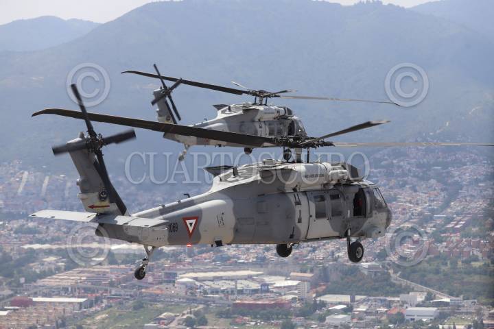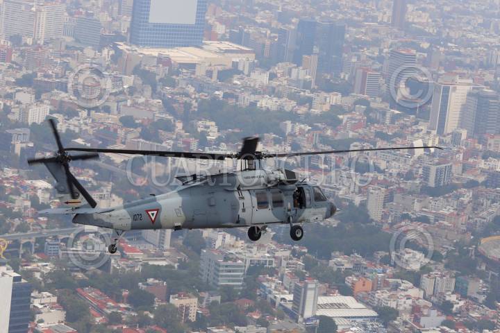 CIUDAD DE MÉXICO, 16SEPTIEMBRE2023.- Helicópteros UH-60 Black Hawk realizan un sobrevuelo por la capital del país como parte del desfile militar por el 213 aniversario del Inicio de la Independencia Nacional, despegando de la Base Aérea Militar Nº 1 Santa Lucia. FOTO: EDGAR NEGRETE LIRA/CUARTOSCURO.COM