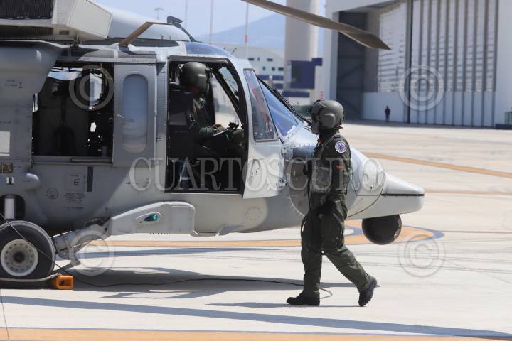 CIUDAD DE MÉXICO, 16SEPTIEMBRE2023.- Tripulante y un elemento de un UH-60 Black Hawk se despiden previo a su participación en el desfile militar por el 213 aniversario del Inicio de la Independencia Nacional, despegando de la Base Aérea Militar Nº 1 Santa Lucia. FOTO: EDGAR NEGRETE LIRA/CUARTOSCURO.COM