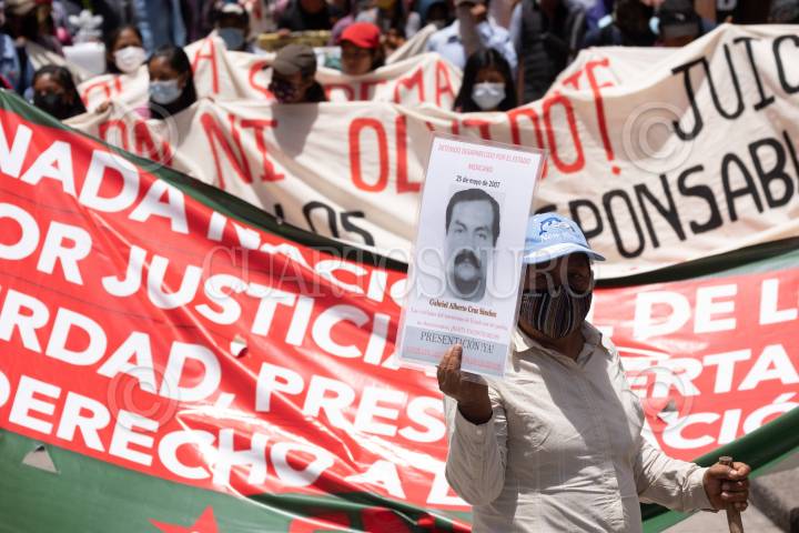 Integrantes del Frente Nacional de la Lucha por el Socialismo (FNLS), de las diferentes regiones del estado, realizaron una marcha y un mitin político en la Plaza de la Paz para denunciar que las desapariciones forzadas en el territorio mexicano continúan