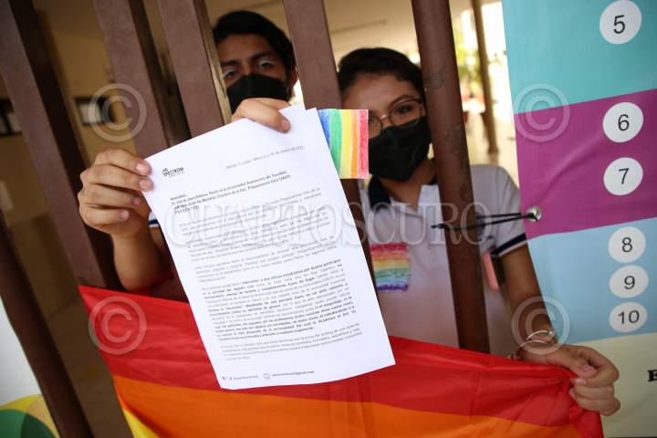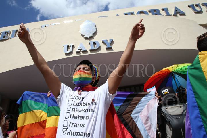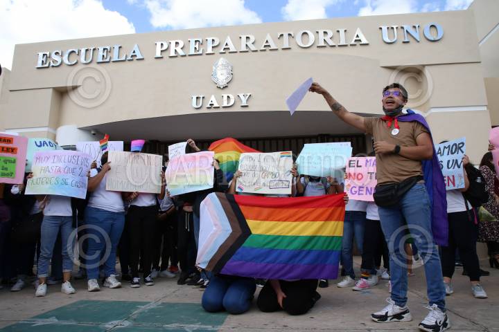 Esta tarde, estudiantes de la Preparatoria Uno de la Universidad de Yucatán (UADY), acompañados por activistas de la comunidad LGTB y organizaciones de la sociedad civil, realizaron una protesta a las afueras del plantel para exigir a las autoridades educativas una disculpa pública luego de los actos discriminatorios y transfóbicos que se registraron contra alumnos y alumnas en el marco de los festejos del día de San Valentín.