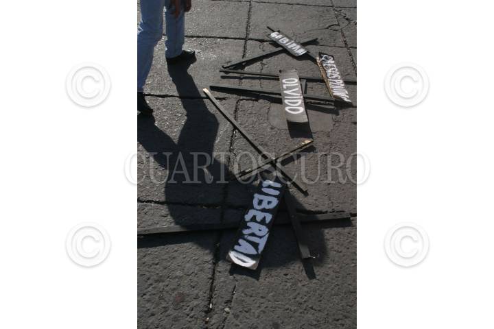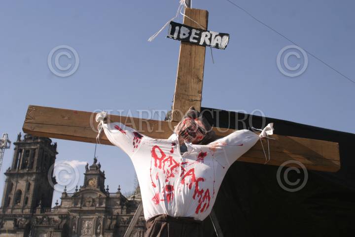 MEXICO, D.F. 18MARZO2005.- La Coordinadora Oaxaqueña Magonista Popular Antineoliberal (COMPA) se manifestó en el zócalo para exigir el respeto a los derechos humanos de los ciudadanos oaxaqueños y por la libertad de los presos políticos del estado al que pertenecen. En la gráfica una representación crucificada del actual gobernador de Oaxaca Ulises Ruiz (PRI). FOTO: Iván Stephens/CUARTOSCURO.COM