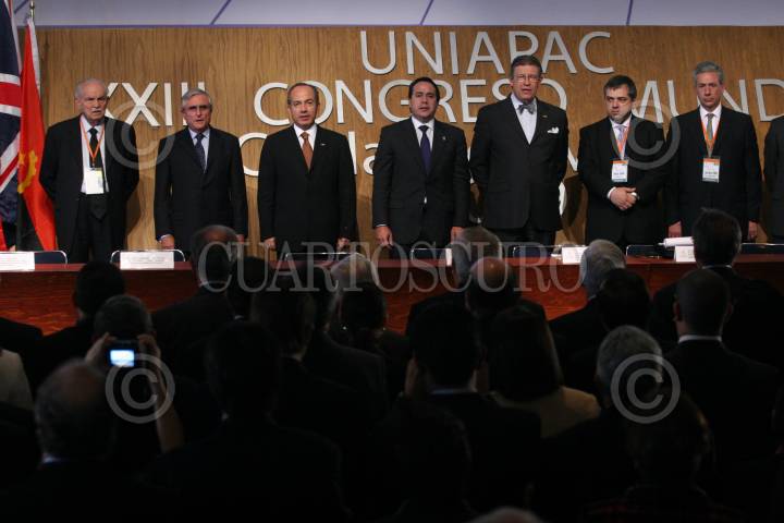 MÉXICO, D.F., 012OCTUBRE2009.-Lorenzo Servitje Sendra, Fundador de Grupo BIMBO; Jose Ignacio Mariscal Torroella, presidente de la Unión Internacional Cristiana de Dirigentes de Empresas: Felipe Calderón Hinojosa; presidente de México; Gerardo Ruiz Mateos, Secretario de Economía; Luis Peña Stettner, presidente de la Confederación de las Uniones Sociales de Empresarios de México; Pascual Rubiani y José Ma. Simone, Socio fundador de Solinfi durante la XXIII Congreso Mundial UNIAPAC.. FOTO: IVAN STEPHENS/CUARTOSCURO.COM