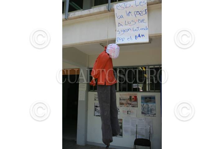 QUERETARO, QUERETARO, 13MAYO2010.- A manera de ironía contra la violencia ocurrida hacia las víctimas atrapadas en fuego cruzado en la guerra entre el gobierno federal y el narcotráfico, alumnos de la Facultad de Sociología colocaron una propuesta de maniquíes victimados en los pasillos de la facultad. FOTO: DEMIAN CHAVEZ/CUARTOSCURO.COM