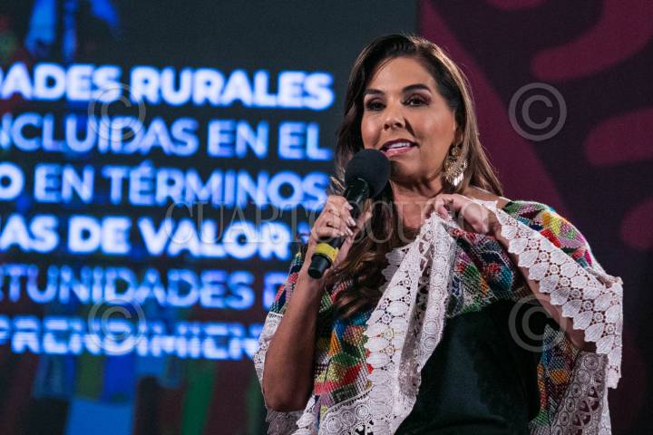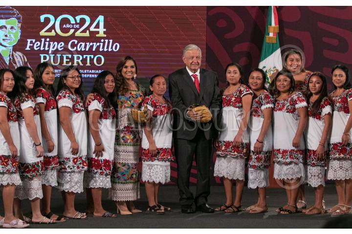 CIUDAD DE MÉXICO, 05AGOSTO2024.- Andrés Manuel López Obrador, Presidente de México, encabezo la mañanera en la cual se informo de los avances del Tren Maya. Lo acompañó la gobernadora de Quintana Roo, Mara Lezama, quién resaltó los beneficios del llamado "Jaguar Rodante" en el sureste mexicano. Cómo invitadas especiales acudieron la jugadoras de softball integrantes del equipo de Las Diablillas de Hodtzonot, quienes le regalaron un guante de béisbol al mandatario tabasqueño. FOTO: MOISÉS PABLO/CUARTOSCURO.COM