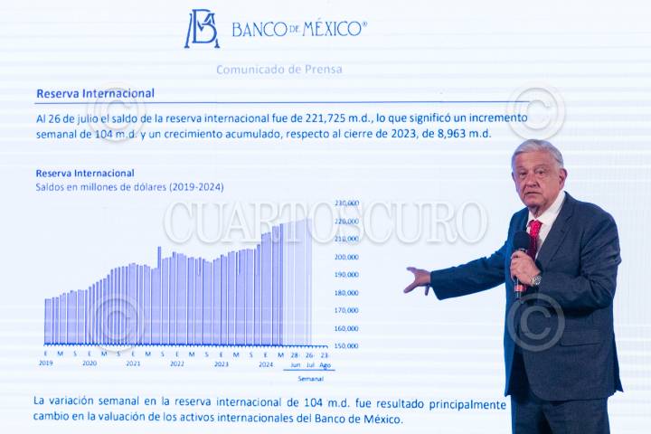 CIUDAD DE MÉXICO, 05AGOSTO2024.- Andrés Manuel López Obrador, Presidente de México, muestra una gráfica con las reservas federales de México que ascienden a 221, 725 millones de dólares, las cuales blindan a la economía mexicana, esto ante las caídas de las bolsas de valores en el mundo. FOTO: MOISÉS PABLO/CUARTOSCURO.COM