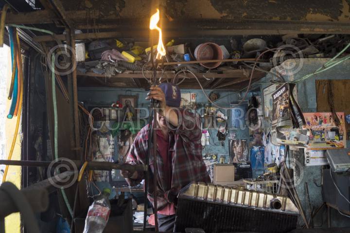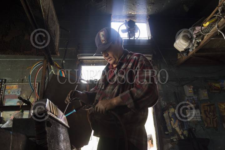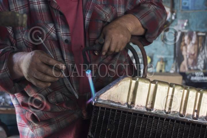 MÉXICO, DF., 01ABRIL2014.- Desde los diez años Juan José es soldador de radiadores. Su padre le enseñó el oficio que hoy es considerado practicamente artesanal. Con un soplete y estaño fundido solda los radiadores de sus clientes. "Casi todos los coches de ahora están hechos de aluminio, que en nada se compara con la duración del estaño". FOTO: MARÍA JOSÉ MARTÍNEZ /CUARTOSCURO.COM