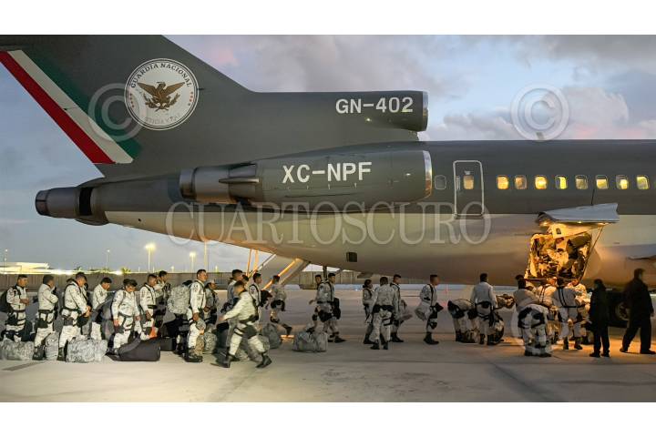 CANCÚN, QUINTANA ROO, 04FEBRERO2025.- Elementos de la Guardia Nacional partieron durante las primeras horas del aeropuerto de Cancún hacia la frontera norte a fin de reforzar los trabajos de seguridad tras los acuerdos entre el gobierno mexicano y estadounidense para evitar la aplicación del 25?aranceles. FOTO: ELIZABETH RUIZ/CUARTOSCURO.COM