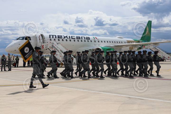 ZUMPANGO, EDOMEX, 01JULIO2025.- Elementos de la Guardia Nacional se retiran de la pista luego del aterrizaje de la nueva aeronave de Mexicana de Aviación. FOTO: DANIEL AUGUSTO/ CUARTOSCURO.COM
