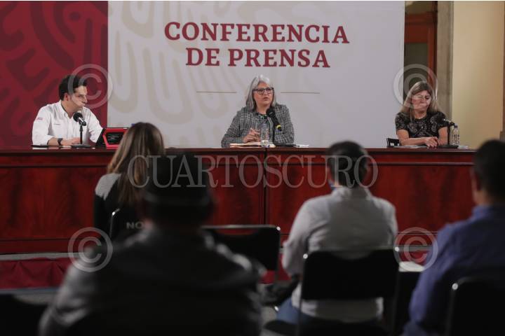 Graciela Márquez Colín, secretaria de Economía; Zoe Robledo Aburto, director del IMSS, y Rocío Mejía Flores, coordinadora del programa Microcréditos para el Bienestar, durante la conferencia