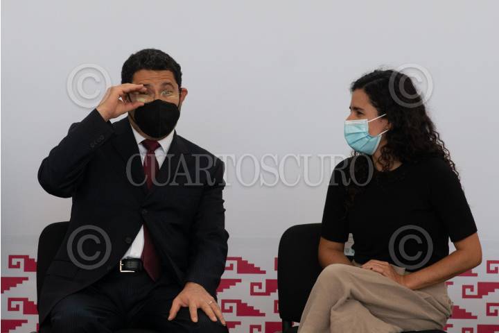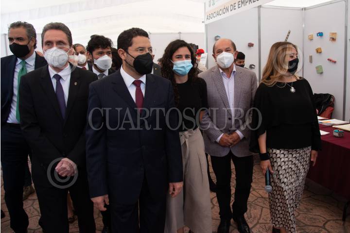 Martí Batres, secretario de Gobierno capitalino, y Luisa María Alcalde Luján, secretaria de Trabajo y Previsión Social, durante la inauguración de la Feria Nacional de Empleo 2021.