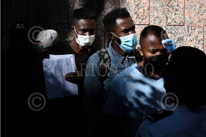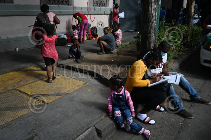 Personas de origen haitiano esperan su turno para ingresar a las instalaciones de la COMAR.