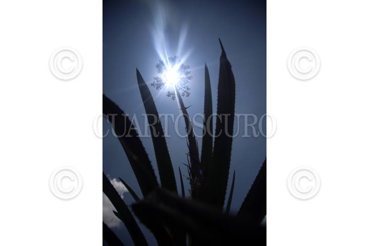 CUERNAVACA, MORELOS, 21JUNIO2019. Hoy inicia el solsticio de verano, este día será el más largo del año durando 13 horas y 25 minutos. En la imagen el sol atraviesa el cenit, provocando un contraluz con una flor de maguey en la Barranca Hormiga Roja en el poniente del estado, en la frontera con el Estado de México. FOTO: MARGARITO PÉREZ RETANA /CUARTOSCURO.COM