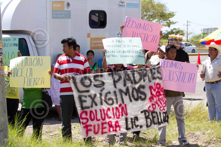 VILLAHERMOSA, TABASCO, 12MARZO2012.- Habitantes se manifiestan con pancartas pidiendo solución a sus demandas en las inmediaciones del lugar en donde el presidente Felipe Calderón Hinojosa encabezará un evento. FOTO: MARCO POLO GUZMÁN HERNÁNDEZ/CUARTOSCURO.COM