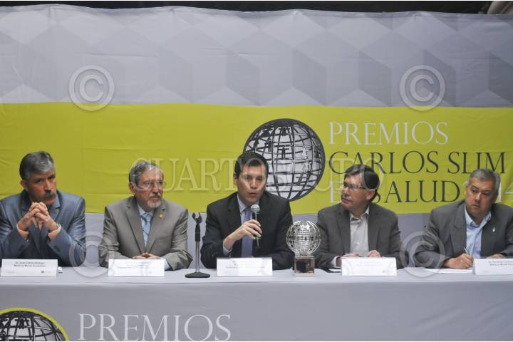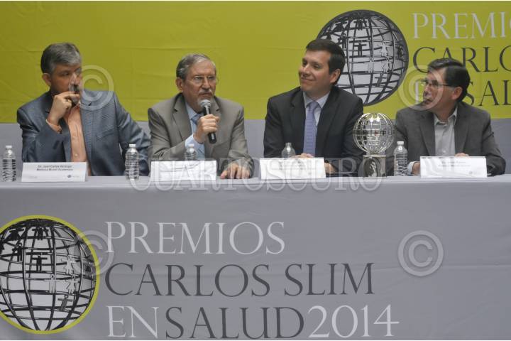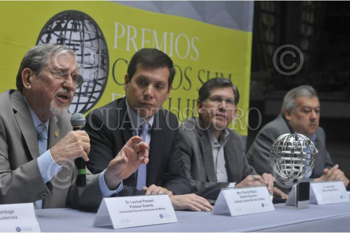 MÉXICO, D.F., 26MARZO2014.- Conferencia de prensa donde el Instituto Carlos Slim de la Salud, encabezado por Ricardo Mújica, director ejecutivo, presentó a los ganadores de este año en sus dos categorías; por Trayectoria en Investigación se reconoció al doctor Lourival Possani, profesor emérito de la UNAM, y por categoría en Instituto Excepcional se reconoció al grupo Medicus Mundi, encabezado por los doctores Juan Carlos Verdugo, de Guatemala, Javier Román, de Bolivia, y Fernando Carbone, de Perú. El instituto que otorga los premios busca reconocer a quienes generan soluciones innovadoras, sustentables y repicables para atender los principales problemas de salud en México y Latinoamérica. FOTO: DIEGO SIMÓN SÁNCHEZ /CUARTOSCURO.COM